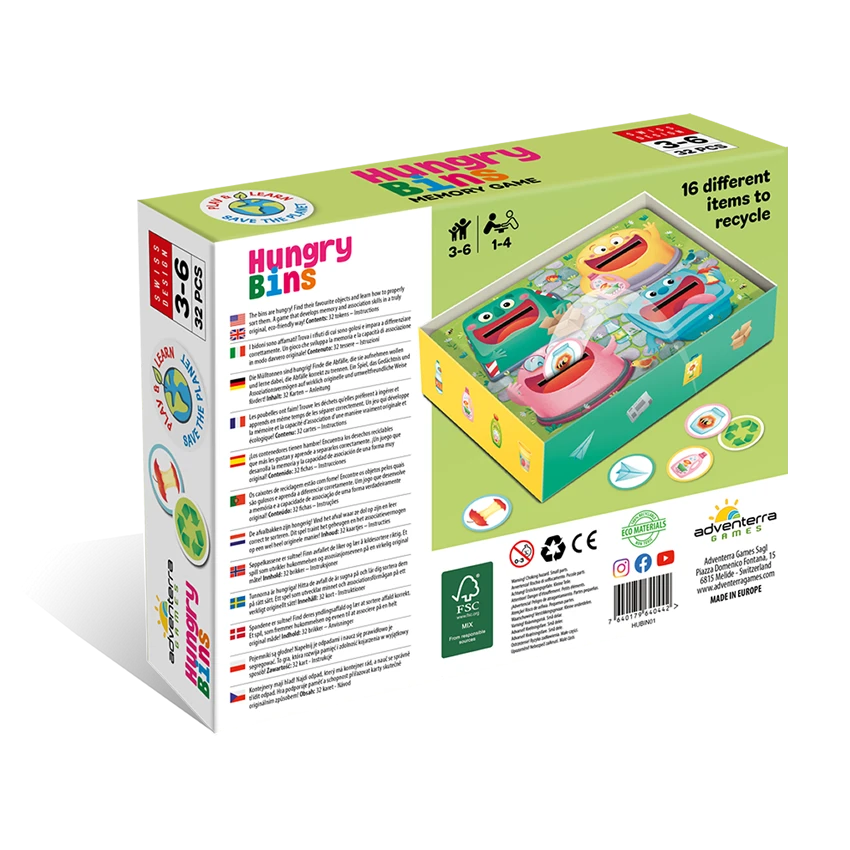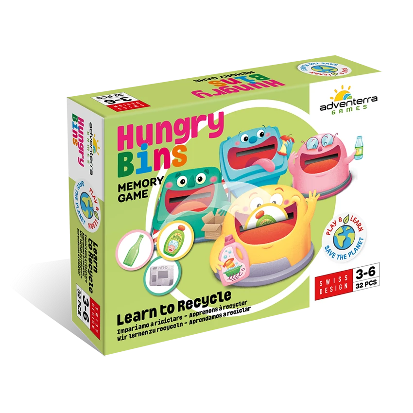 Hungry Bins is a classification game that introduces children to how to recycle and compost. Children discover different types of materials and learn to recognize their respective collection bins. To make the matching process easier, each token features the color of the corresponding bin.
