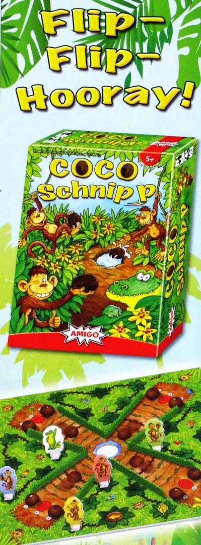 Manfred and Wolfgang Ludwig’s Coco Schnipp trades on this antipathy, pitting the player monkeys against a nasty crocodile while also racing against one another. Each player places his monkey on the starting line of the game board and takes possession of three colored coconuts: red, blue and yellow. On a turn, a player spins the wheel: