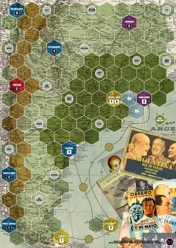 Age of Steam Expansion: Argentina / The French Riviera is a new pair of expansions for use with Age of Steam. Each new map in this expansion includes a new type of hex, with Argentina featuring the pampas and The French Riviera showcasing the expensive French coast.