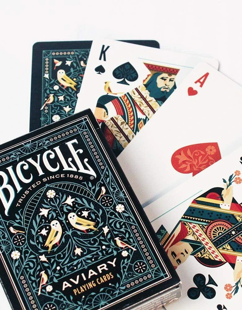 Let your next card game take flight with Bicycleยฎ Aviary playing cards! Featuring custom illustrated faces, suits, and card backs the Bicycle Aviary deck is a beautiful, intricately designed deck of playing cards that will make a perfect addition to your collection.