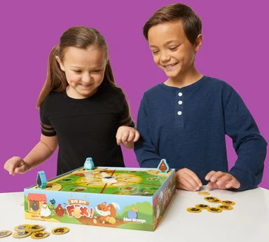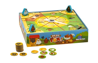 Bye Bye Mr. Fox! is a co-operative game that teaches young players about teamwork and strategy. Work together to help the hens keep their eggs safe from the cunning Mr. Fox! Spin the spinner to see what will move this turn: an egg, a chicken, or Mr. Fox? Move three eggs into each hen’s house to win!
