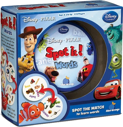 The popular DisneyโขPixar cast invites you on a learning adventure! Kids will play with Lightening McQueen, Nemo, WallโขE, and all their favorite characters from the box-office hits and boost early reading skills by racing to spot matches between basic words and the corresponding pictures. Each card is decorated with a variety of images from the DisneyโขPixar films, so the whole family will also have fun connecting an image to the movie it comes from! Between any two cards, there is always one match. Spot it first to win!