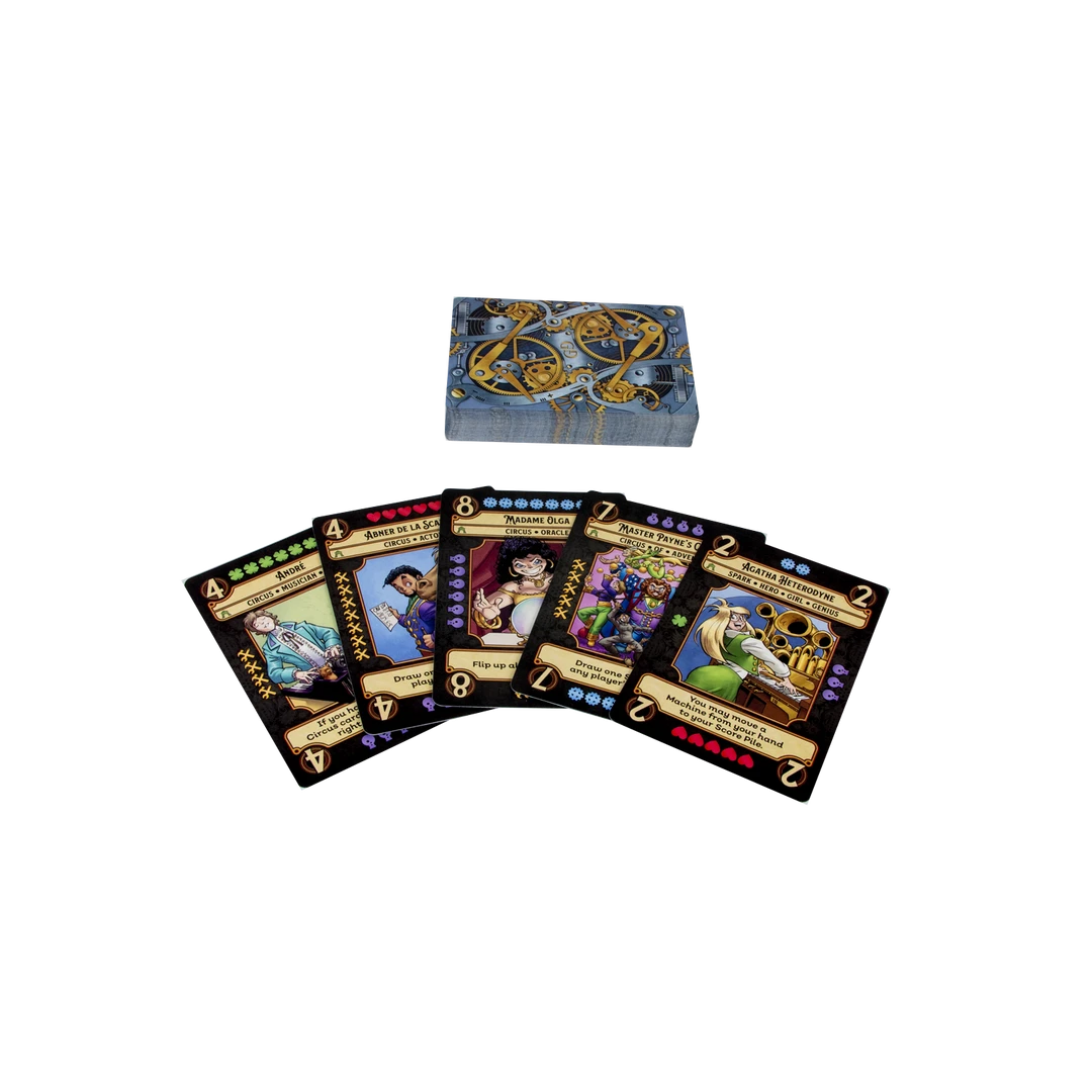 Master Payne’s Circus of Adventure contains story elements from Agatha’s time in the circus as well as her visit to Sturmhalten. Unique character blocks in this deck include Circus Cards, Mimmoths, and some fairly nasty Villains. Roughly ten cards in this deck are part of Master Payne’s traveling circus. Although these Circus Cards have different effects, popping some — such as André and Lars — grant you an automatic win if you have five or more Circus Cards in your score pile!