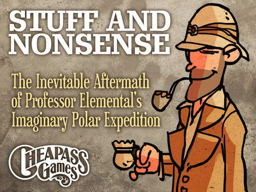 Stuff and Nonsense is “the Inevitable Aftermath of Professor Elemental’s Imaginary Polar Expedition,” an adventure game about never leaving London. The players move about the city, collecting artifacts and stories, and then return to the Adventurer’s Club to tell made-up stories of adventure. This game plays something like a board game, though the board is made entirely of cards. The mechanics revolve around collecting sets of cards, while trying to avoid meeting Professor Elemental, and deciding which destinations to pretend to return from. The cards are filled with humorous text and whimsical illustrations by Harold Fay.