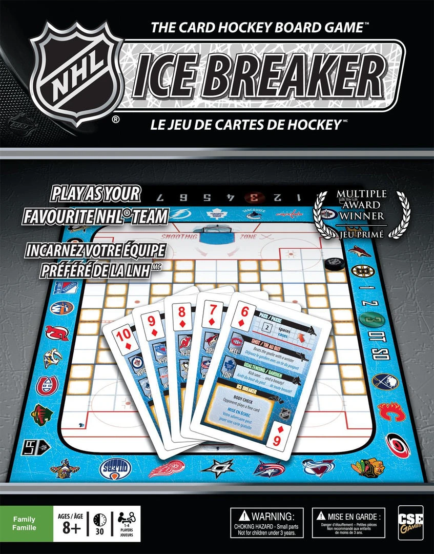 NHL Ice Breaker is licensed by the National Hockey League and features the leagueโs 30 teams plus national teams. You get all the great action of the game on the ice with NHL Ice Breaker. Game play is built around CSE Games’ specially-designed 54-card playing deck (52 standard suited cards plus two Jokers). Each action in NHL Ice Breaker is based on the basic principle of high hand wins. Opponents play their card(s) at the same time to battle for puck possession, and the player with the highest hand gets to execute his/her action indicated on the card(s) played.