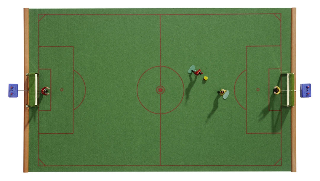 The colour on the top of the ball determines who is next to kick. The kicker puts the field player next to the ball and releases its leg to kick the ball. The other player should try to block the kick with his or her goal keeper. After the kick the possession is once more decided and the same procedure starts all over again.