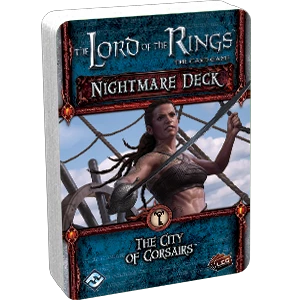 The City of Corsairs Adventure Pack features two separate encounter sets, one for the land and one for the sea. Now, should you reach the shores of Umbar, The City of Corsairs Nightmare Deck increases the peril of the second encounter deck by adding treacherous new locations like the Umbar Bridge and bringing the pride and ruthlessness of the Corsairs to the forefront with cards like Inspiring Fury.