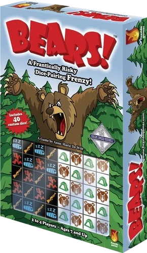 Bears! is a fast-playing, competitive game in which you score points by pairing dice. Shoot bears and run from tents for a few points, or take a risk and score big by sleeping through the attack! But watch out! If any bears remain at the end of the round, your sleeping campers are done for!
