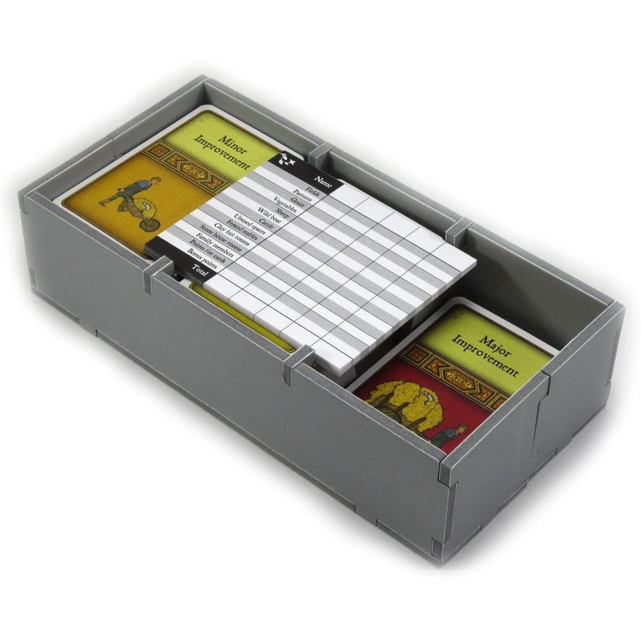 This insert is designed to be compatible with Agricolaยฎ, both the original version, and the revised 2016 version with the wooden animeeples. The design provides both efficient storage and improved game play. Many of the trays can be utilised during the game, and they greatly aid set-up and clear-away times. The boards and player boards act as a lid on top of the trays.