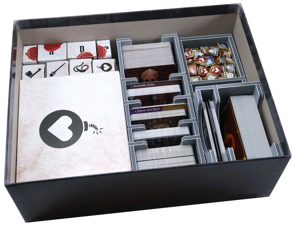 Insert compatible with Gloomhaven: Jaws of the Lion. The design provides both efficient storage and improved game play. Many of the trays can be utilised during the game, and they greatly aid set-up and clear-away times. The insert is arranged in three layers.