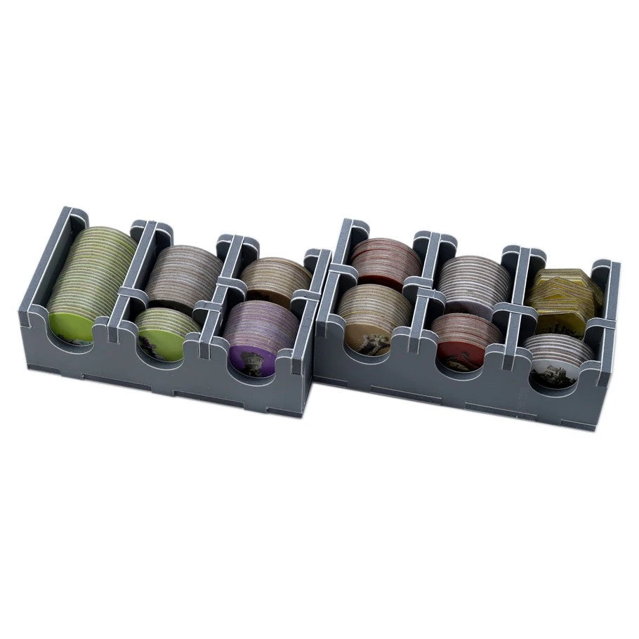 This insert is designed to be compatible with Mage Knight Board Game, and the Shades of Tezla, Krang Character and The Lost Legion expansions. The design provides both efficient storage and improved game play. Many of the trays can be utilized during the game, and they greatly aid set-up and clear-away times. The board and rule books act as a lid on top of the trays.