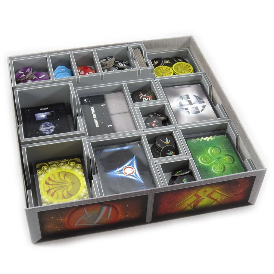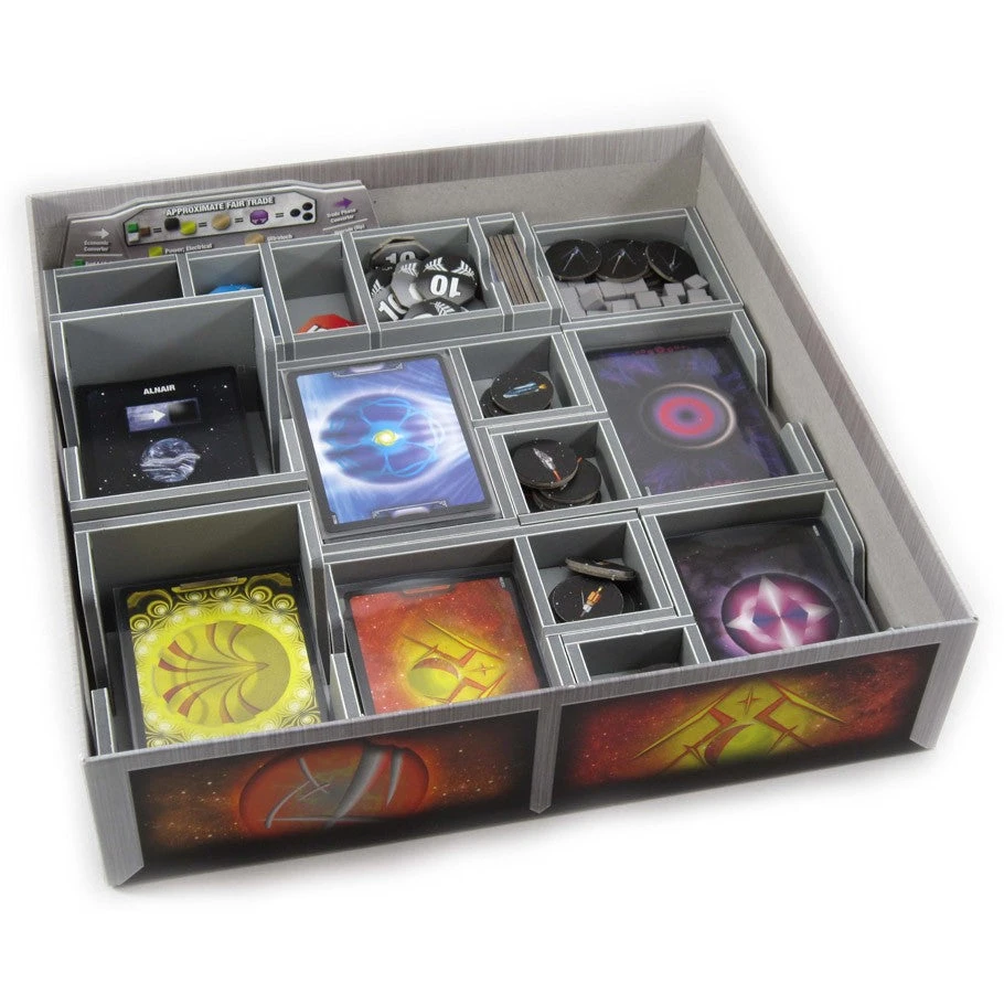 Insert compatible with Sidereal Confluence®. The design provides both efficient storage and improved game play. Many of the trays can be utilised during the game, and they greatly aid set-up and clear-away times. The rules and race sheets act as a lid on top of the trays.
