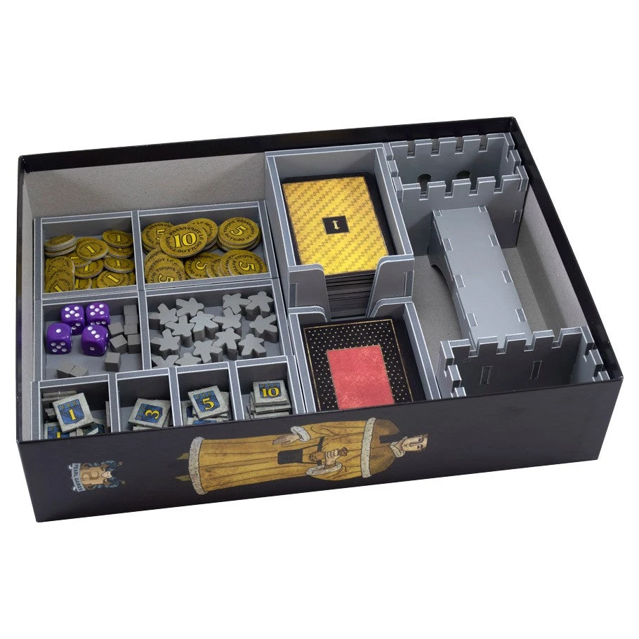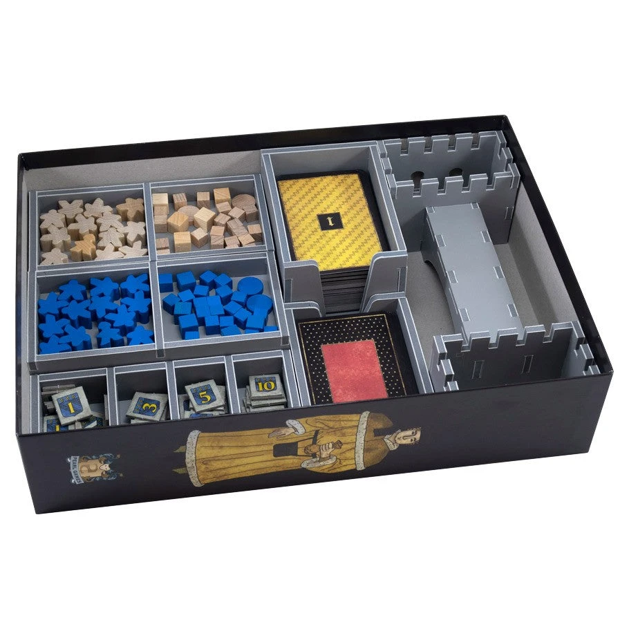Insert compatible with Troyes®, and The Ladies of Troyes® expansion. The design provides both efficient storage and improved game play. Many of the trays can be utilised during the game, and they greatly aid set-up and clear-away times. The rules and boards act as a lid on top of the trays.