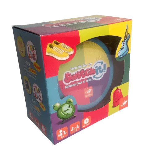 Switch It! is a fast-paced game where players try to be the first to locate objects or colors depending on if it’s nighttime or daytime. It’s nighttime! Act fast to find the OBJECT that appears the most on the card. It’s daytime! Quickly find the COLOR that appears the most on the card. Special situations arise that add a clever twist to the chaos making Switch It! the game of choice for those who like to THINK and ACT fast.