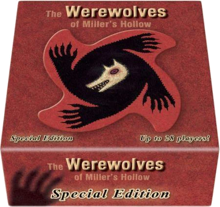 Werewolves of Miller’s Hollow is a game that takes place in a small village which is haunted by werewolves. Each player is secretly assigned a role – Werewolf, Ordinary Townsfolk, or special character such as The Sheriff, The Hunter, the Witch, the Little Girl, The Fortune Teller and so on… There is also a Moderator player who controls the flow of the game. The game alternates between night and day phases. At night, the Werewolves secretly choose a Villager to kill. During the day, the Villager who was killed is revealed and is out of the game. The remaining Villagers (normal and special villagers alike) then deliberate and vote on a player they suspect is a Werewolf, helped (or hindered) by the clues the special characters add to the general deliberation. The chosen player is “lynched”, reveals his/her role and is out of the game. Werewolf is a social game that requires no equipment to play, and can accommodate almost any large group of players.
