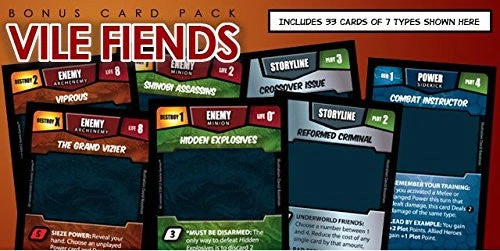 THE EVIL HAS ARRIVED. A dark power has awakened and infiltrated the city from beyond our world. Our heroes must face Viprous, the venomous Archenemy. Or perhaps they will battle a horde of Shinobi Assassins and disarm Hidden Explosives. A new ally joins your ranks in the form of the Combat Instructor. And heroes may now have Storylines which reveal their dark pasts. Some may even be Reformed Criminals. Be prepared for anything! Vile Fiends is a limited edition mini-expansion for the Heroes of Metro City game and requires that game to play.