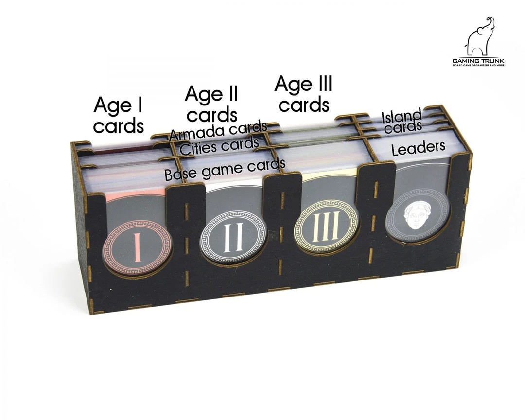 Card tray keeps all cards from the base game and the expansions. Cards are sorted by the Age number with each expansion separately within the Age. Additional section of the tray assigned for the Leaders cards and the Island cards separated by their level. Just pull out the tray and place it on the table.