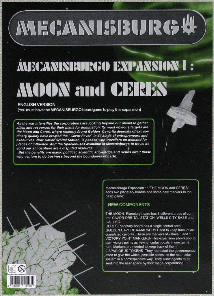 This expansion adds two planetary boards and new markers to the game. Players can now explore the Moon and Ceres by sending agents using two government spaciobuses to travel there. The Moon includes 3 locations to visit and control. Ceres includes 1 new location to control. Also agents can become Directors or Consuls for several locations which give political benefits.