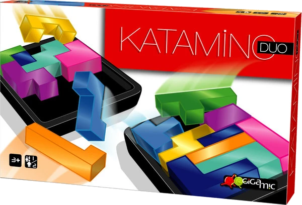 Katamino Duo – a.k.a., Katamini – is a junior version of Katamino, with two players competing on separate game boards (or possibly one game board divided into smaller spaces) to fill all of the empty spaces first. The game is played over a number of rounds, with each round becoming progressively harder.