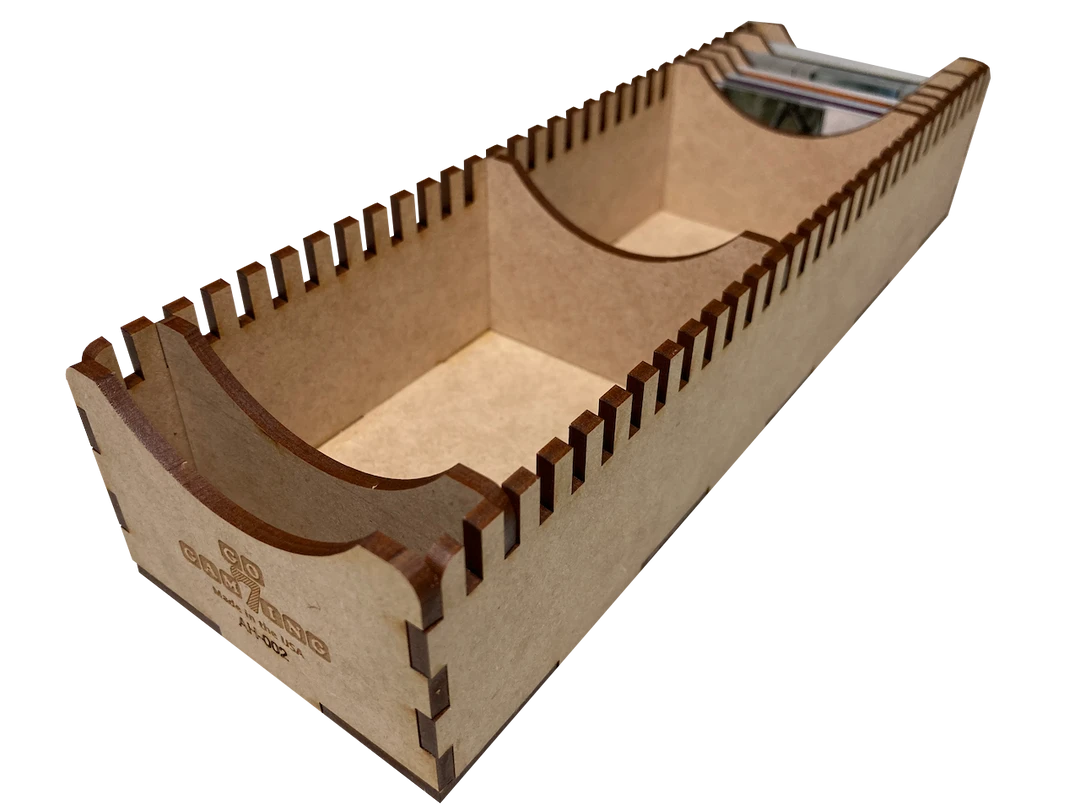 Arkham Horror 3rd edition posed a unique challenge with regards to the event and monster deck dispenser. Once built, they consume a large volume of space in the box and cardboard doesn’t last forever with heavy use. For this reason, we designed an event and monster deck dispenser out of wood that stores within the box and functionally replaces the FFG cardboard event deck dispenser.