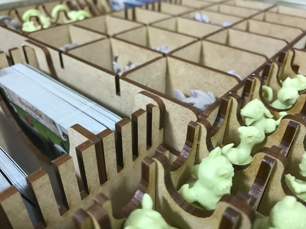 Our storage solution for Arcadia Quest: Inferno Pets provides storage for minis, large cards, small cards, and map tiles in four custom trays. This solution is designed to be placed in a Pets box.