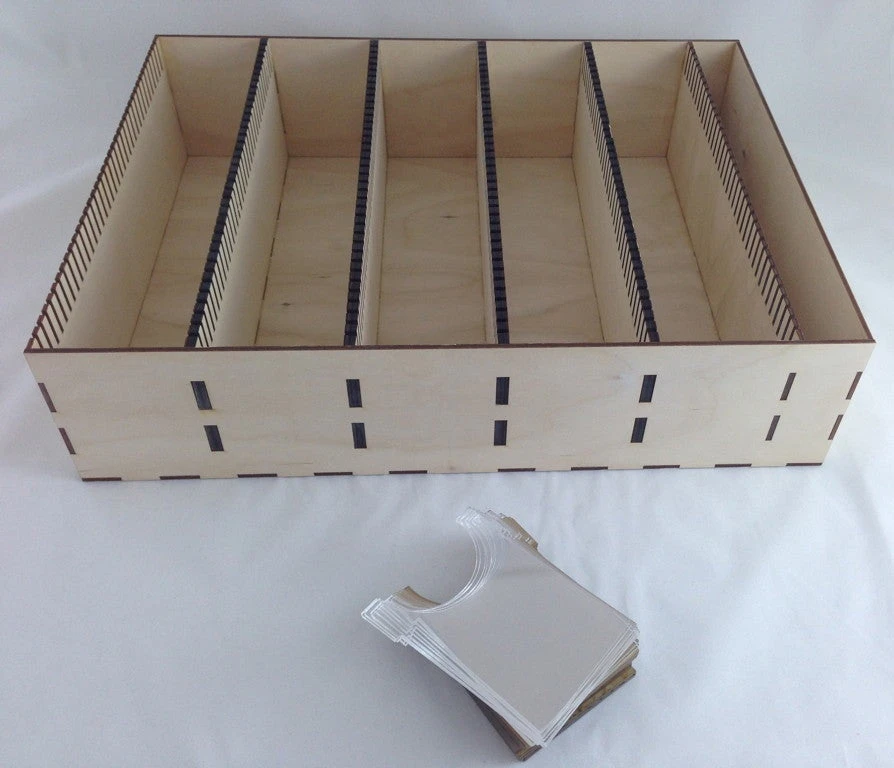 - This insert measures 100mm high and provides five (5) organizational lanes for vertical card storage and one (1) smaller lane for bit storage. The interior divider walls of this insert are ~6mm (2 x 3mm) so that dividers can be placed side-by-side, allowing for many more dividers in this insert. As a consequence of using 6mm inner lanes, Bit Boxes will not fit in the narrow bit lane of this insert, which is 29mm wide.