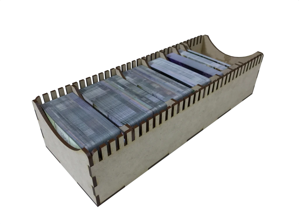 - Large Cards: This insert has 279mm of large card lane storage. It can store ~996 unsleeved cards or ~558 FFG sleeved cards (.50mm per card). Keep in mind each divider will also use 3mm of card lane space. The values used for the card thickness estimate = .28mm.