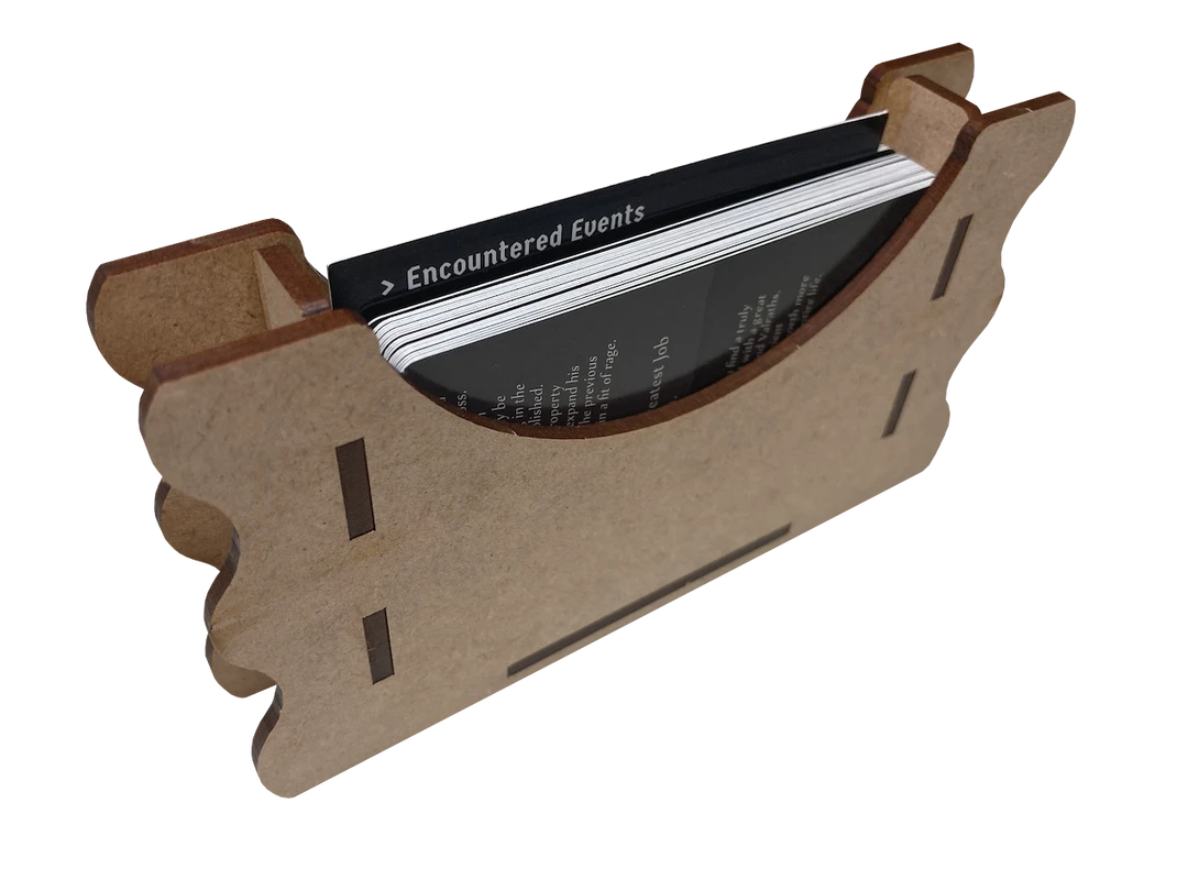 - One (1) small card tray with etched dividers that stores sleeved or unsleeved cards