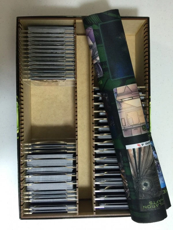 This insert is designed to fit inside the Legendary Encountersย boxes (Aliens, Predator, Firefly). ย These games have a ton of cards and this insert will allow you to store the cards conveniently grouped for faster setup. ย The play mat forย Encountersย can be folded several times and stored in the center storage area, which features a cutout so that the ends of the mat are not squashed. ย The mat fits end-to-end just as well as it did in the original game box insert, but takes less room in the box.