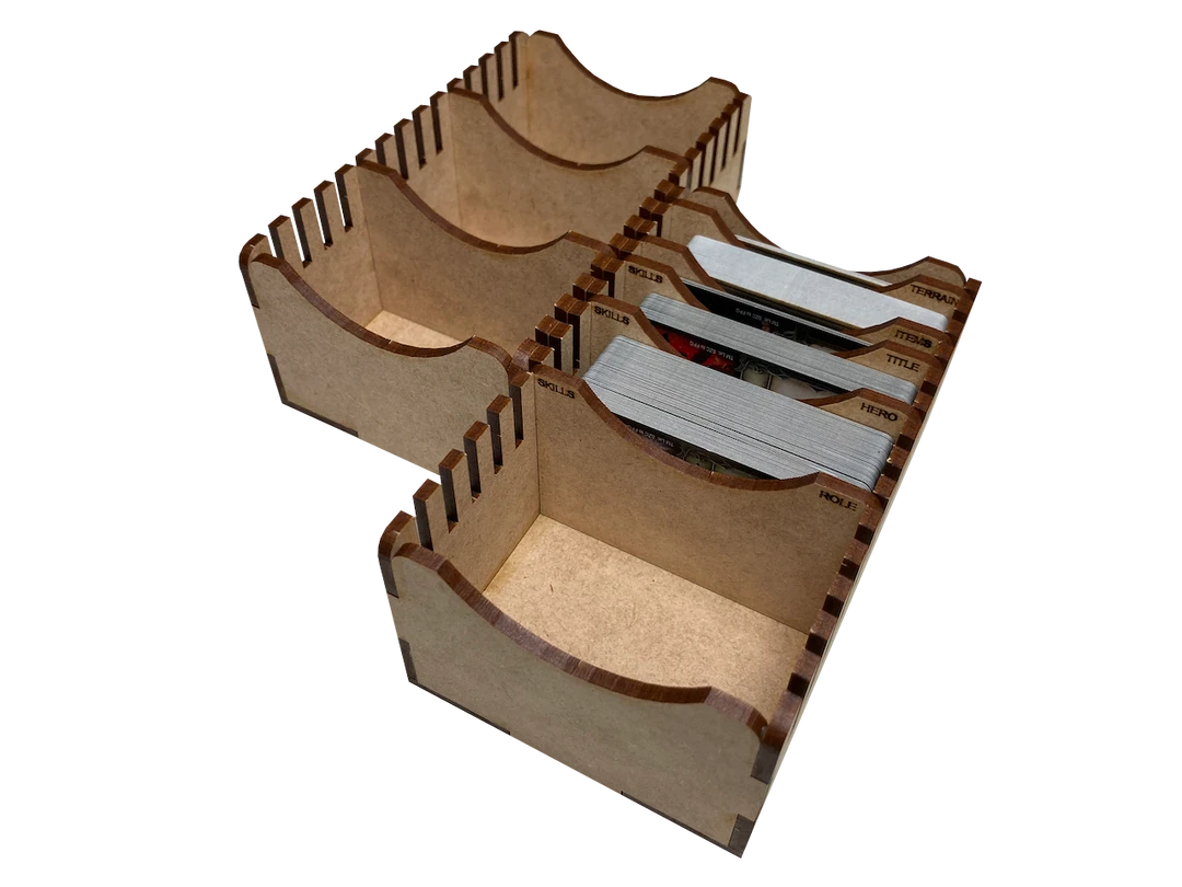 This kit provides five (5) etched dividers for card types: item, terrain, hero skills, role skills, and title skills. There are also two (2) blank dividers provided.
