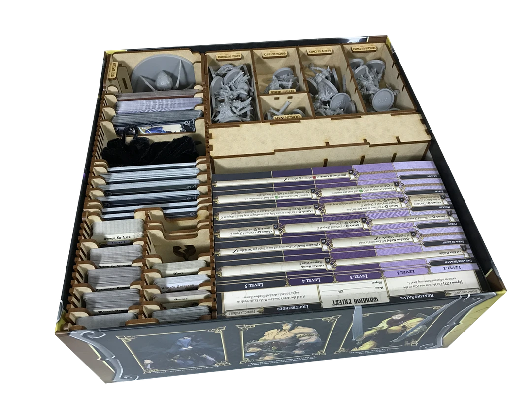 This solution is designed with a rectangle of unused space at the top where you can store your player dashboards and all class pads (add-ons too). This unused space can be filled in using our MD-002 Tray kit, which will offer additional minis storage space in the base box. However, you will then need to store your player dashboards and class pads in one of the smaller add-on boxes.