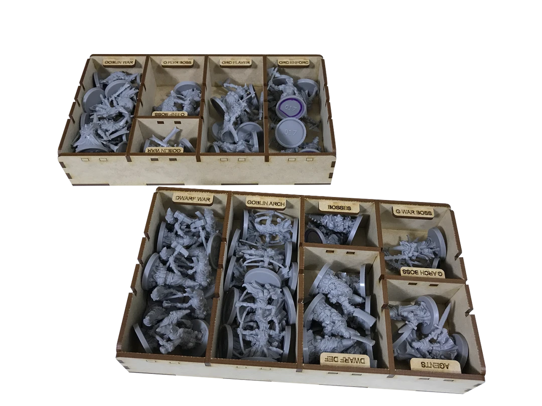 - Beyond the two choices above, consider that the MD-001 solution handles the base game and includes etched name tabs for all heroes and monster classes in the base game. The MD-007 handles storage of many of the Kickstarter extras. Our MD-002 offers two additional trays usable in your base game insert. If you use the the MD-002 you will need to store you player dashboards and class pads in one of more smaller add-on boxes. This may cause lid lift in the smaller boxes (Cockatrix, Tusk), if you don’t have one of the taller small boxes (Hellphant, Spearmaiden Cyclops).The MD-003insert is usable in either the Sorcerers vs Lord Tusk or Noble Warriors vs The Cockatrix add-on boxes and stores the minis from both of these add-ons. The MD-004 insert is usable in either the Bloodmoon Assassins vs The Hellephant or Warrior Priests vs The Spearmaiden Cyclops boxes and stores the minis from both of these add-ons. The MD-005 insert is usable in either the Elementals, Ratlings, or Troglodytes boxes and is designed to store the minis from Elementals and Troglodytes together in a single box. The MD-006insert is usable only in the Reptisaurians box and is designed to store the minis from Reptisaurians and Ratlings together in a single box. Finally, the MD-008 provides etched name tabs for all heroes and monster classes within the expansions and Kickstarter extras.
