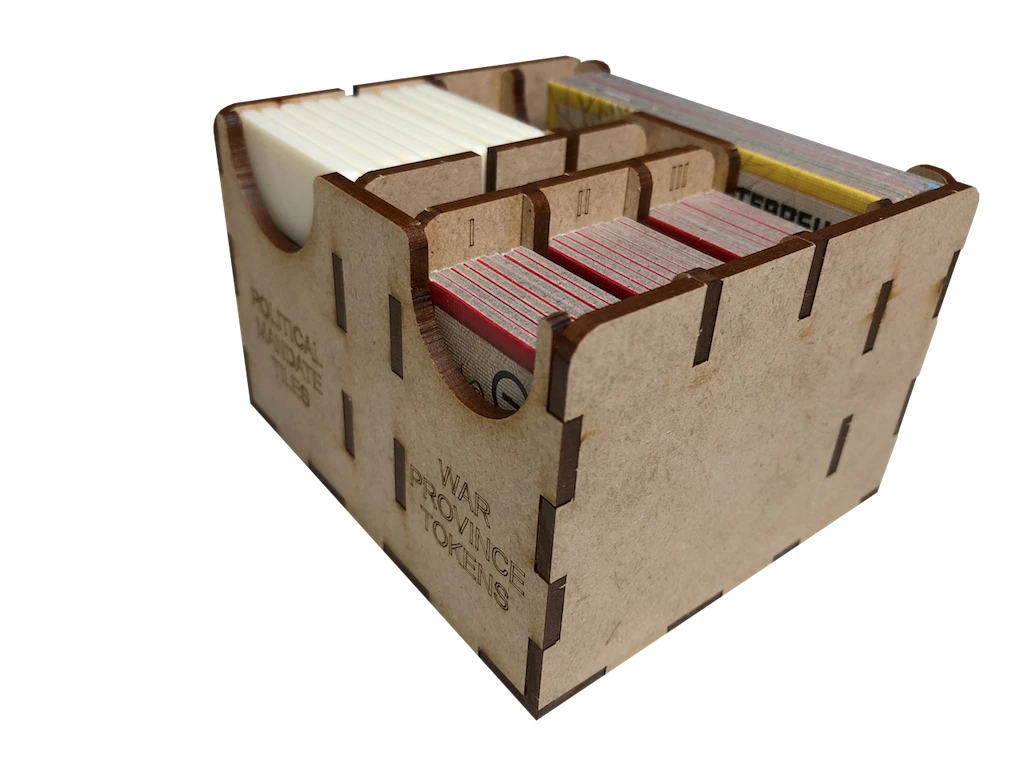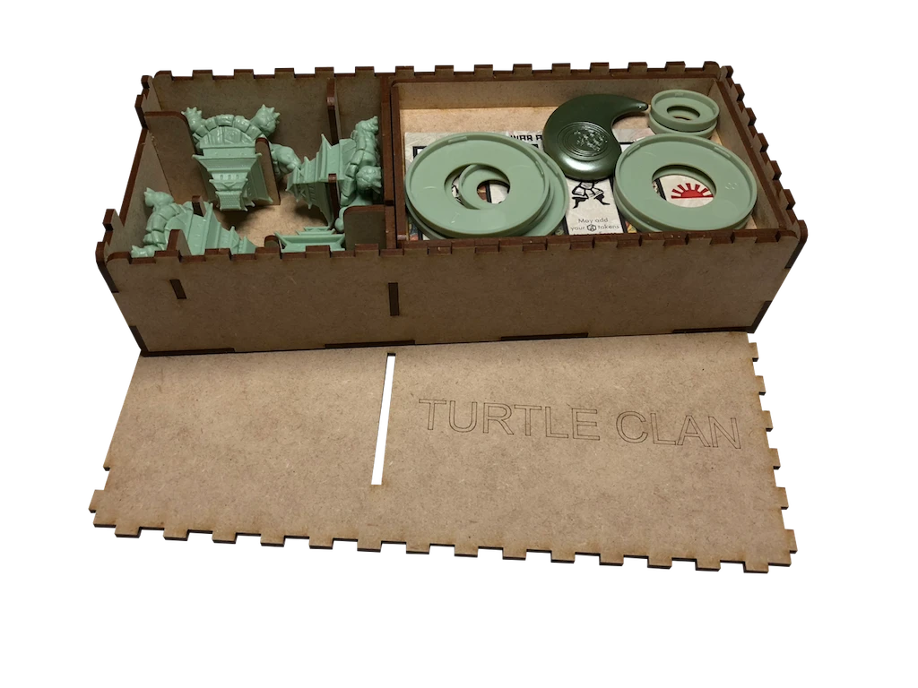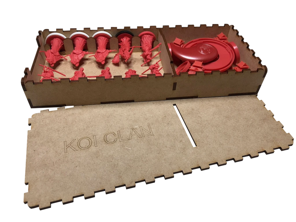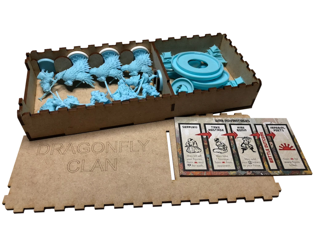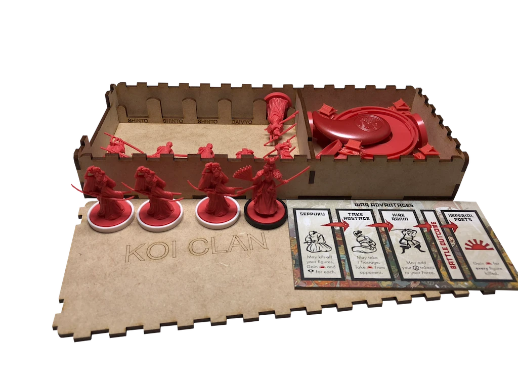 Our storage solution for the Rising Sun™ base game provides a total storage solution for the base game components. This solution includes nine (9) storage trays, five (5) of which are clan storage boxes that storage all clan components.