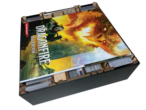 The Dragonfire images depict the insert being used to store all content announced through early next year unsleeved (all content through Sword Mountains Crypt, which has a street date of Feb. 6, 2019 is shown stored in the insert in these images. This content was available to attendees at GenCon and other conventions in summer 2018.) If you sleeve, you will eventually need additional storage space, depending on what you own when considering the content through Sword Mountains Crypt.