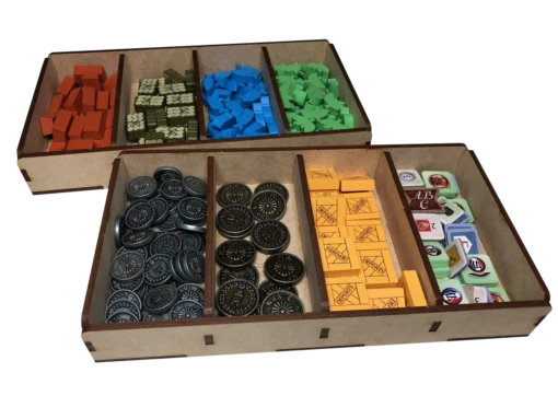 - one (1) top tray that provides storage for all player boards and larger tokens. We provide convenient lift cutouts beneath each compartment for quick removal of components