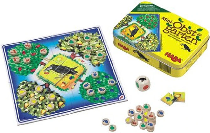 Obstgarten is a cooperative game for two or more players aged 3 and up. Only a quick harvesting of the trees carrying crunchy cherries, juicy apples, sweet pears and marvellous plums prevents the snitching of fruits by the impudent and insatiable raven. All players work together to harvest the fruits.