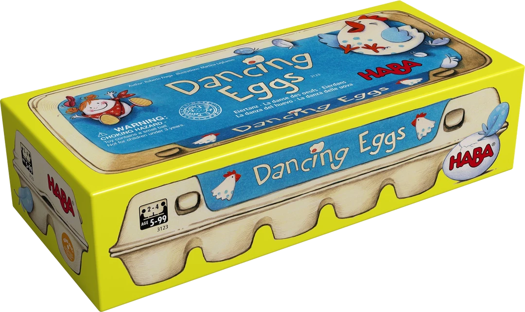 The object of the game is to accumulate the most points. First a player rolls the red die. Depending on the result of the die roll, players can: attempt to be the first to take an egg from the box (or steal from someone else if there are none left in the box); drop an egg on the table and then compete to catch it; or even get up and run around the table to try to be the first back to their seat. When a player successfully wins an egg, he or she then rolls the white die, which indicates the location of the egg; between your cheek and your shoulder, your chin and the breast, between your knees, etc. When the first person drops an egg, the game ends and the one having the most points wins the game.