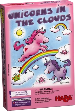 To start, all unicorns stand on the thundercloud. On a turn, a player rolls the blue storm die and either moves 1-3 clouds or stands in place eating a muffin, forgetting all about the race, the crystals, and everything else. If you land on a pink cloud, you roll the crystal die and receive 1-3 crystals; if you land on a present, you give someone else a crystal from the reserve; and if you land on the front end of a rainbow, you slide along the path to the next cloud. Whoever reaches the final cloud first claims the four crystals there, then players compare their holdings to see who horned their way to victory.