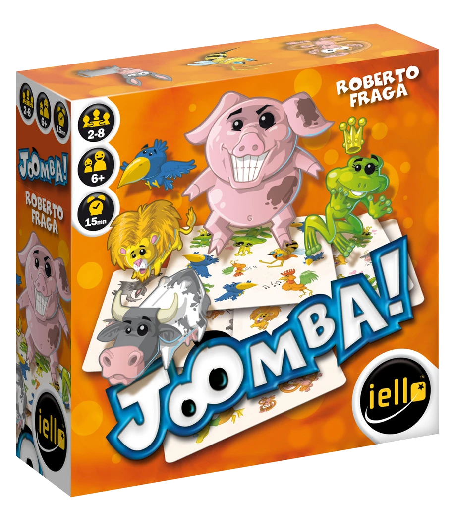 Joomba! is a simple party game in which players want to claim as many cards as possible. On a turn you reveal an animal card so that all players can see it; each card features four types of animals on it, with one animal type being present once, another being present twice, another three times, and the final type four times. Competing against everyone else, you must identify the animal that appears on the revealed card a number of times equal to the number on the back of the next card in the deck, then imitate the sound that animal makes.