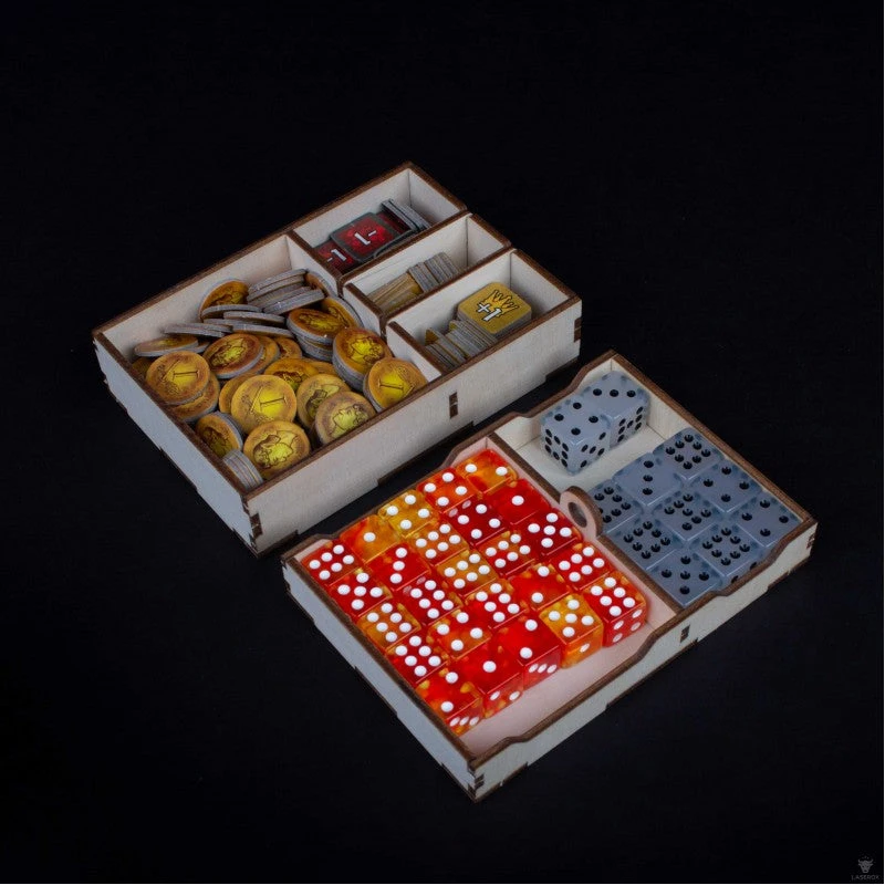 - removable trays for dice, tokens and coins
