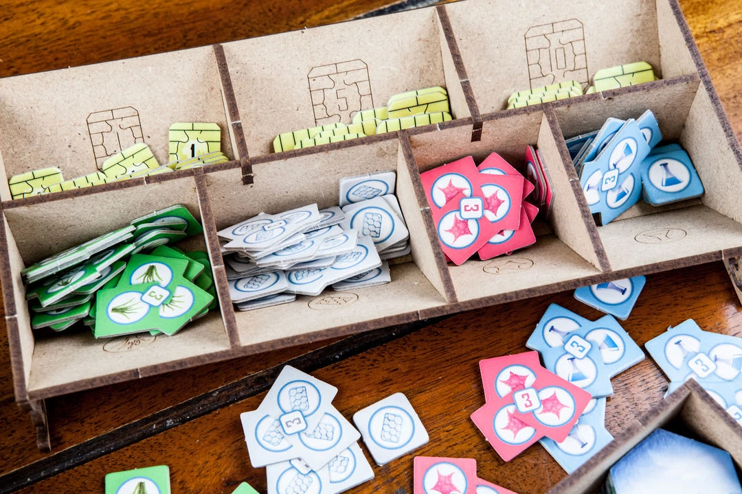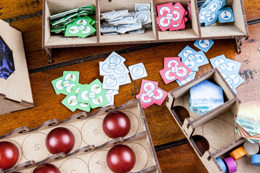 โข 1x container for normal and symbiotic cities, with guide engravings for positioning and number of players. Space for more cities (eg biodome promo);