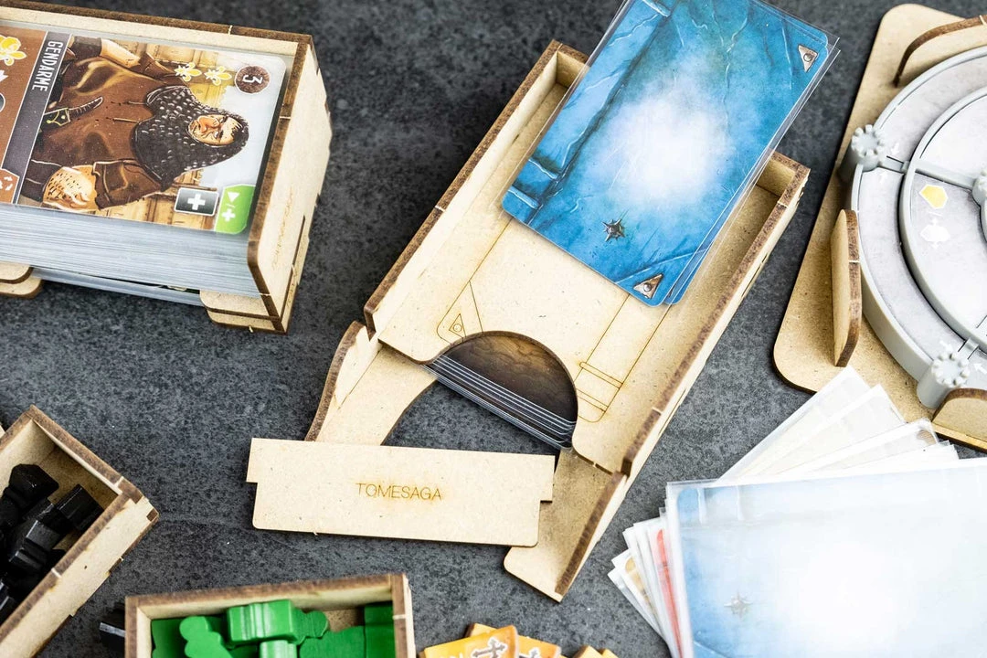 - 3x card holders with dedicated slots and guide engravings. Slot for neutral workers and markers;