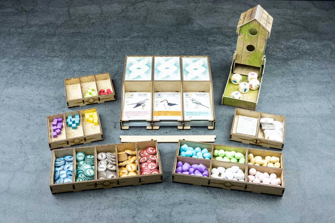 • 1x card holder with slots for bird, objective and automa cards. Further 3 slots for gameplay’s 3 shown birds;