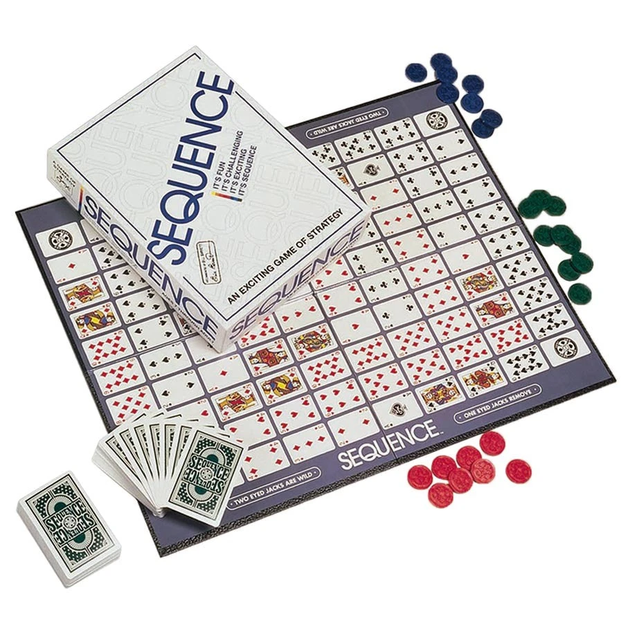 Sequence is a board and card game. The board shows all the cards (except for the Jacks) of two (2) standard 52-card decks, laid in a 10 x 10 pattern. The four corners are free spaces and count for all players equally.