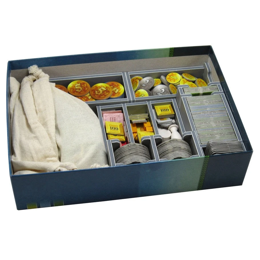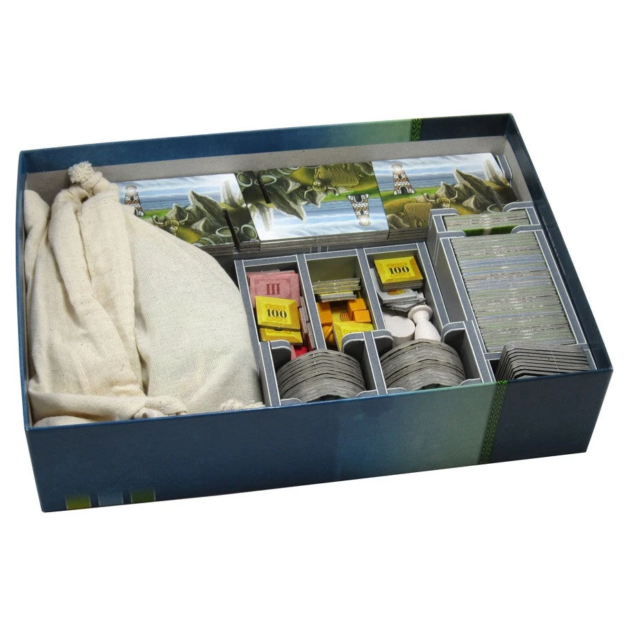 Insert compatible with Isle of Skye® and the Journeymen® and Druids® expansions. The design provides both efficient storage and improved game play. The trays can be utilized during the game, and they greatly aid set-up and clear-away times. The rules and boards act as a lid on top of the trays.