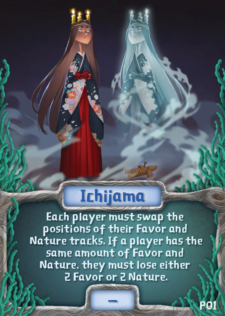 Gameplay: When a player draws from a village deck if Ichijama is drawn immediately reveal it to all players and resolve its effect. After each player has resolved the effect, set Ichijama beside the villager deck and continue drawing cards if any. At the end of the year, after Favor/Nature tracks have been scored, shuffle any set-aside Ichijama cards back into their respective Villager decks.
