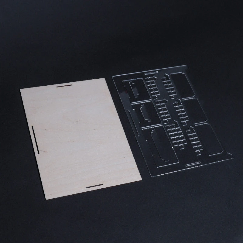 It comes with an acrylic overlay, which is locked in place with a wooden part beneath the playerboard. Three notches come with the overlay, which precisely fit into the holes and lock it together. Some cut-outs are slightly moved, which come from the original player mate design itself. Please be aware of that.
