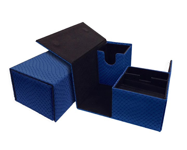 Exclusive textured “Dragonhide” Vinyl box. Holds 2 EDH decks with room for dice and tokens. Comes with a custom designed spindown life counter.