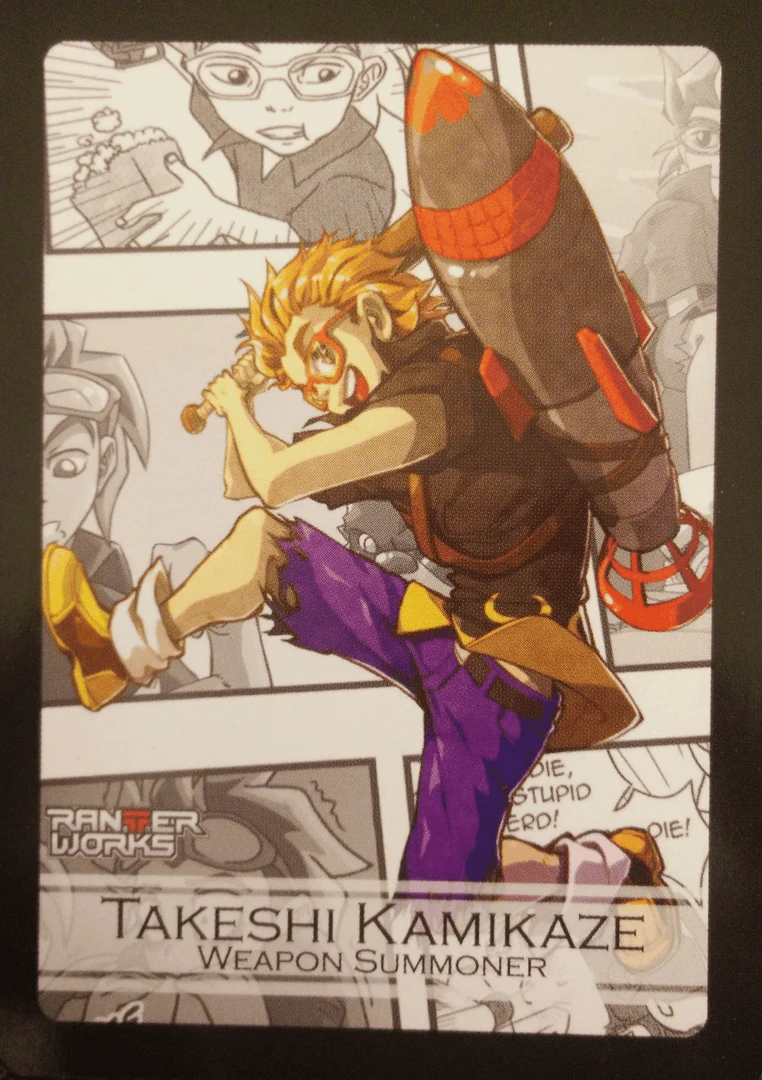 A crossover promotional character created by Fabio Fontes, Takeshi Kamikaze has a stash of eight different weapon cards which he cycles through as the match progresses, each giving him radically different stat bonuses and penalties. With his various weapons giving him wildly different stats, Takeshi performs drastically different when wielding a baseball bat compared to a minigun compared to a butterfly knife, and this combined with the ease at which he permanently discards one weapon to pick up another makes a fight with Takeshi a dramatic and unpredictable affair to participate in. Pick the right weapon for the immediate situation and use it as a silver bullet — or, pick the one that gives your opponent the most fits, and use it as a can opener to pry them open.