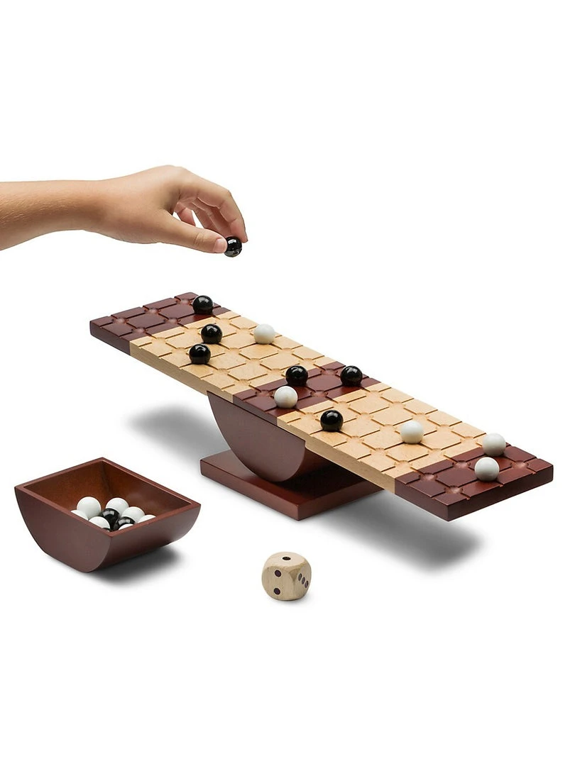 The game consists of: a wooden board affixed to a rounded base, forming a teeter-totter assembly; 14 white marbles and 14 black marbles; and a specially numbered die. The length of the board is engraved with a grid of spaces in which to fit the marbles, 16 rows of 3 spaces each. The goal of the game is for the winning player to move at least 4 of his marbles to one end of the board without either end of the board touching the table at any time.